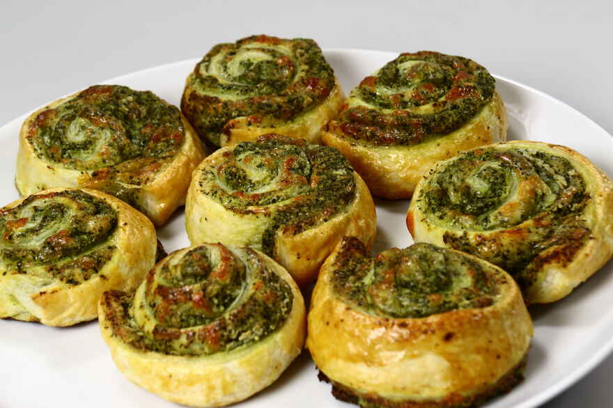 Butterdejen lægges bordet. Smør først et lag flødeost på, vi bruger Bucco Gali. Derefter et lag pesto Vi bruger opskriften her. fordel et tyndt lag revet mozzarella over og rul sammen. Skæres i stykker på ca. 2 cm. og placere dem på en bradepande med bagepapir. Pensles med sammenpisket æg. Bages midt i ovnen i 15-20 min, til dejen har fået nok og har fået en flot gylden farve. Tips: |