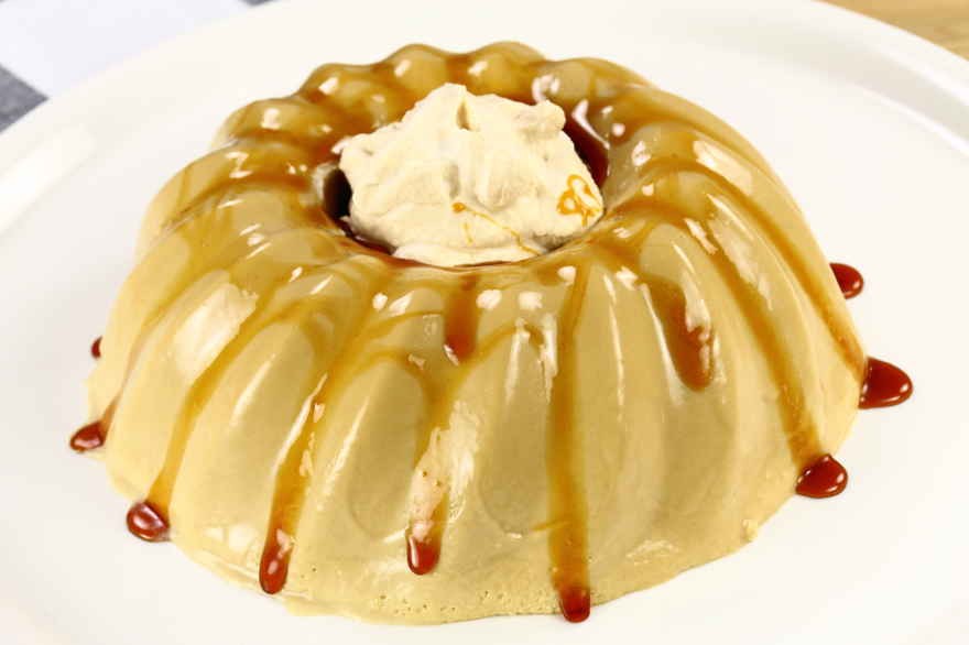 Sukkeret smeltes i en lille gryde, vandet tilsættes og karamellen koger lidt ind til en halv tyktflydende karamel. Æggeblanding: Æggeblommer og brun farin piskes godt sammen 2-5 minutter. Mælkeblanding: Mælk og piskefløde hældes i en gryde og varmes op ved svag varme til lige under kogepunktet, må ikke koge. Gelatinepulver blandes med koldt vand i en lille skål og stilles til side et par minutter. Mælkeblandingen hældes over æggeblandingen i tynd stråle under konstant piskning, det hele hældes tilbage i gryden og blandingen varmes op ved svag varme til den tykner, den må ikke koge. Tag gryden af varmen og tilsæt den tyktflydende karamel og opløste husblaspulver under konstant omrøring så det ikke klumper. Cremen hældes gennem sigte i en skål som sættes i køleskab til afkøling 1-2 timer. Den sidste piskefløde piskes til tynd flødeskum og røres i den afkølede creme. Hæld buddingen i en form eller skål skyllet med koldt vand og evt. drysset med lidt sukker og stil til afkøling min. 6 timer, gerne natten over. Buddingen kan vendes ud af formen, men den kan også serveres i skålen. Serveres med flødeskum, evt. vendt med lidt tyktflydende karamel og med en skål tyktflydende karamel ved siden. Der kan bruges samme opskrift på karamel som til buddingen her. |