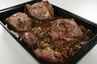 Alle stege brunes af med løg timian, salvie og hvidløg. Rødvin hældes ved stegene og koger lidt med under den sidste stegetid på panden. Stege og det til satte tilbehør lægges i en bradepande og det hele steges færdig i ovnen 15-20 minutter ved 200 grader C. alm. ovn. Det forskellige afskåret kød fra køllen - sener, ben og fedt koges sammen med vand der tilsættes salt og peber. Tilsæt stegeskyen fra kødet og kog det hele godt ned. sigt fonden og jævn den med smørbolle. Kartofler koges uden salt til en mos. - Sigtes og blandes med olie, salt og peber og hakket grønt. Serveres med sauterede grøntsager |