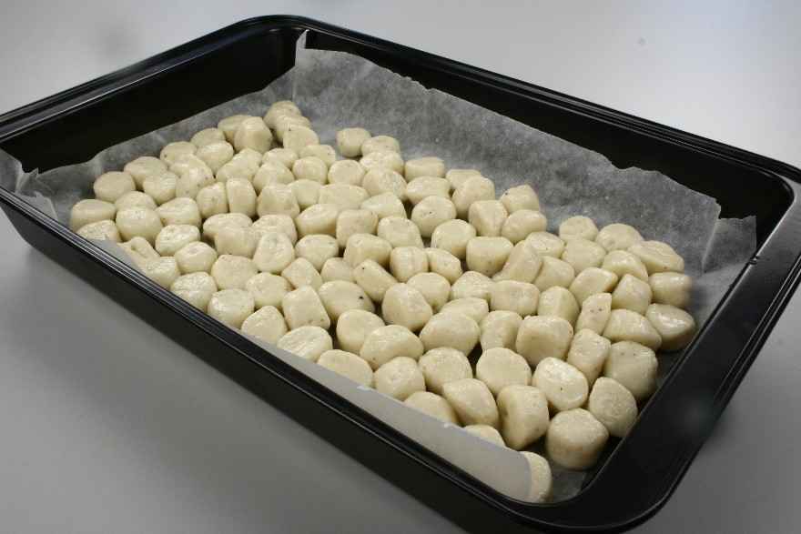 Tag gryden fra varmen og afkøl dejen lidt. Pisk æggene sammen og rør dem i lidt efter lidt. Smag til med salt. Kom dejen i en bollesprøjte, sprøjtepose eller brug en teske til at forme bollerne med. Skær dejen af i passende størrelse ned i varmt vand efterhånden som dejen trykkes ud. Kog melbollerne i letsaltet vand i 5-6 minutter, lad dem koge op et par gange. Tag dem så op med en hulske på en stor tallerken med en omvendt lille tallerken på, så ligger bollerne ikke og svømmer i vand. Kan fryses, men bedst på en plade enkeltvis. Når de er frosne, kan de nedfryses i poser. |