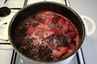 Bærrene skylles og behøves ikke at ribbes fint, de grove stilke fjernes. Bærrene og de ituskårne æbler overhældes med halvdelen af vandet og koges til bærrene brister. Mosen hænges til afdrypning i en saftpose.