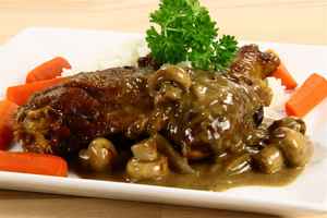 Pil skalotteløgene og hvidløg, svits dem i gryden, læg kyllingestykkerne tilbage i gryden og hæld vinen ved. Lad retten snurre ca. 1 time under låg. Rens svampene og svits dem på en pande i resten af smørret. Kom svampene i gryden og kog kyllingen yderligere 5 min. Tag kyllingestykkerne op og hold dem varme. Pisk fløde og æggeblommer sammen og pisk det i saucen. Varm den igennem, den må ikke koge, og smag til med salt og peber. Server kyllingestykkerne i saucen og byd løse ris og dampede gulerødder til. |