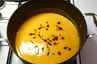 Løget svitses let i lidt olivenolie. Hokkaido, vand samt lidt salt hældes i gryden. Suppen koger nu ved svag varme under låg ca. 45 min. Suppen pureres og smags til med tamari og havsalt. |