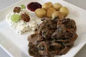 De skrællede gulerødder skæres i tern, svitses i lidt smør sammen med løgene og de rensede champignon. Lad det stege under omrøring i nogle minutter. Dyrekødet i tern brunes i smør i en gryde og krydres med salt og peber. Hæld bouillon og rødvin ved og tilsæt de stødte enebær. Bland de svitsede grøntsager med kødet og lad det småkoge i ca. 1½-2 timer. Tilsæt fløden og smag til med lidt gelé og flere krydderier, hvis nødvendigt. Tilbehør: Serveres med små, smørstegte kartofler og en let waldorff salat med æbler og bladselleri vendt i creme fraiche krydret med salt, peber og citron. |