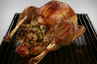 Rør ingredienserne til fyldet sammen. Gnid kalkunen ind og udvendigt med citronsaft og salt. Fyld den, men ikke for hårdt, fyldet svulmer lidt op. Halsskindet kan også fyldes. Luk kalkunen med kødnåle. Smør den udvendigt med 50 g smør. Læg kalkunen på risten i bradepanden med brystet opad. Sæt den i en 180 grader C. alm. ovn og steg den i ca. fire timer. Dryp flittigt undervejs med 3 dl god fjerkræbouillon og 2 dl vand. Når det er dryppet over øses sky fra bradepanden over kalkunen.