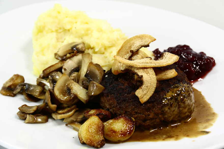 Champignoner skåret i skiver sauteres i det overskydende fedt, fedt og champignon tages af og champignoner gemmes til tilbehør de smeltede spæk kasseres.