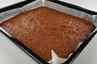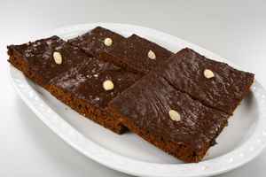 Bages ved 175 grader C. alm. ovn i ca. 25 minutter. Udskæres i firkantede snitter, der pensles med smeltet overtrækschokolade (gerne mens de endnu er varme) og pyntes med halve smuttede mandler. |