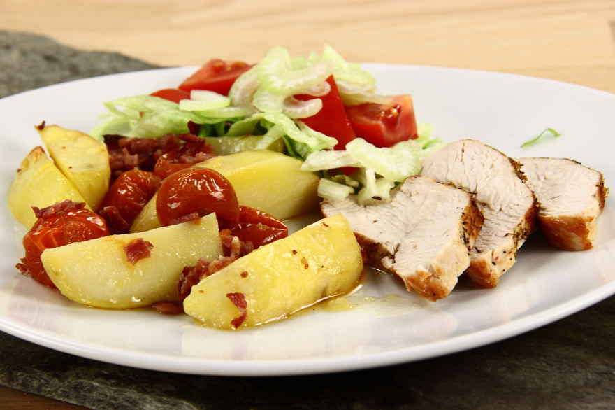Kartoflerne vaskes, skæres i både og rulles i hakket Kalkunbacon og hvidløg, dysses med salt og lægges i ildfast fad sammen med fileten og små cherrytomater. Retten bages ved 200 grader C. alm. ovn i 60 minutter. Mærk om kartoflerne er møre, er de ikke det så tages kalkunbrystet op og får lov at trække en 15 minutter mens kartoflerne gives skstra tid i ovnen. |