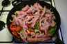 Rødløgene skæres i tynde både. Peberfrugterne skæres i strimler.