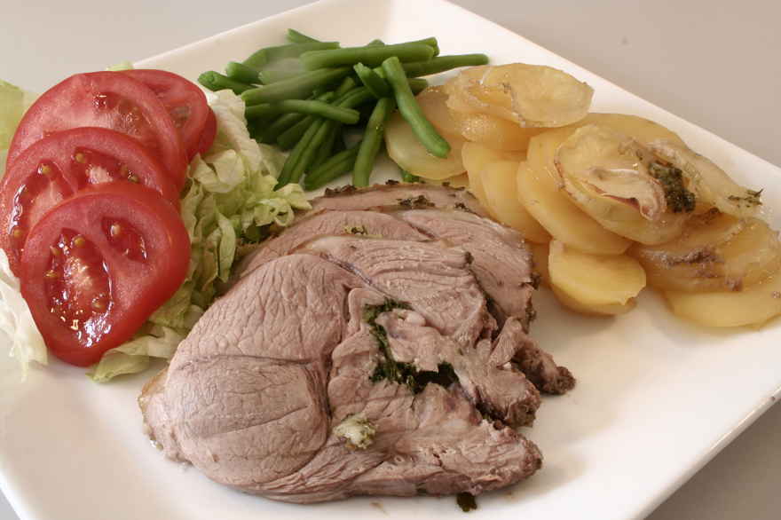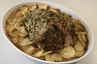 Kartoflerne skæres i tynde skiver, der lægges taglagt i et ildfast fad eller lille bradepande. Bouillon hældes ved, og lammekøllen lægges på kartoflerne. Stilles i ovnen ca. 45 min ved 160 grader C alm. ovn. Franskbrødskrumme, hvidløg, citronsaft, persille og margarine røres sammen og smøres på kødet. Stilles atter i ovnen ca. 45 min. ved 160 grader. Køllen trækker i ca. 20 min. indpakket i folie inden den skæres i skiver. Kartoflerne hældes i en skål og serveres til sammen med bønner, ærter eller broccoli. |