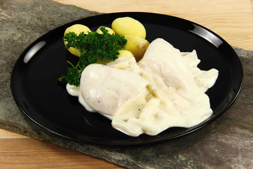 Når kyllingen er afkølet pilles kødet fra benene, deles i grove stykker og læges til side. Sauce: Smørret smeltes og melet tilsættes under omrøring. Mælken hældes i lidt efter lidt under konstant omrøring og dernæst aspargesvandet. Når sovsen er jævn, smages den til med salt og peber. kyllingekød og asparges tilsættes og nu må det ikke længere koge. Serveres med nye kartofler eller små pillekartofler. Tips: I stedet for hvide asparges på dåse kan bruges friske hvide asparges, ca. 1 kg. i forhold til 2 ds. Aspargeserne skrælles og koges i letsaltet vand i ca. 15 min, hvis de er friske. Kog gerne 2 kyllinger og brug de små stykker kød til høns i tarteletter dagen efter, ca. halvdelen af kødet. |