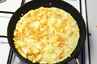 Pisk æggene sammen tilsæt salt og peber og hæld æggemassen jævnt over grønsagerne i panden. steg ved svag varme til æggemassen er stivnet. Omeletten bør serveres med fuldkornsbrød til |